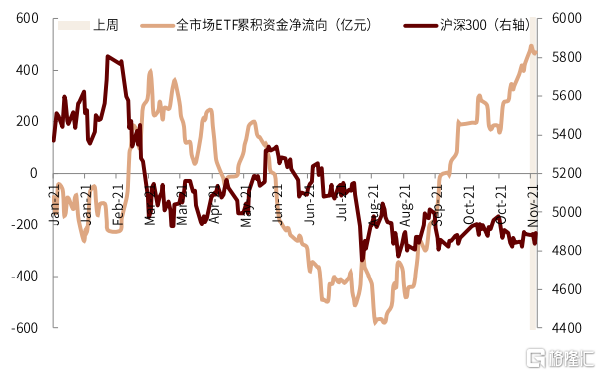 圖表:國內ETF資金淨流量與滬深300指數走勢對比