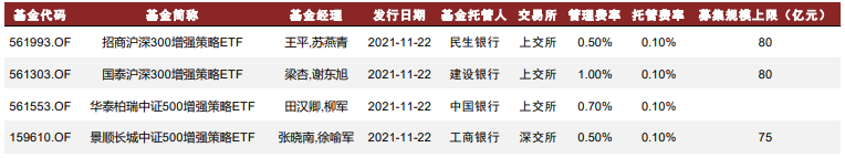 本次獲批的5只產品中,包括招商、國泰、華泰柏瑞與景順長城基金在內的4只產品將於22日開始發售。其中,招商與國泰基金旗下的增強ETF產品募集規模上限80億元,景順長城基金旗下的增強ETF募集規模上限75億元,而華泰柏瑞旗下增強ETF暫未對募集規模設限。