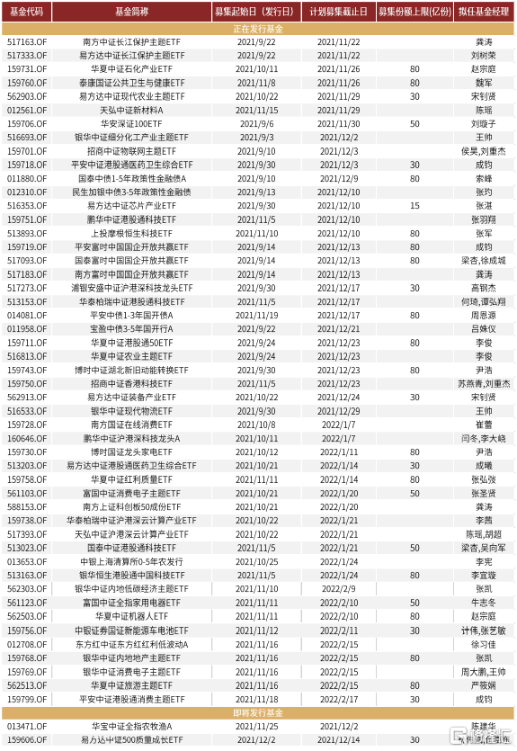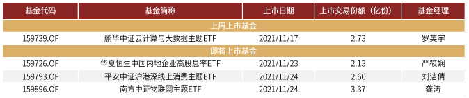 市場規模:1)存量:截止2021年11月19日,國內市場各類指數產品合計1059只,其中,ETF數量達600只,總規模合計13967億元,非貨幣ETF規模達10443億元,股票型ETF規模達9096億元。2)增量:上週4只ETF成立,規模貢獻12億元,首發規模小幅回升。3)市場格局:華夏、易方達和國泰基金非貨幣ETF規模居於前三,管理規模分別達2275億元(佔比21.8%)、1298億元(佔比12.4%)和948億元(佔比9.1%),規模前十大公司市場份額穩定在80%左右。