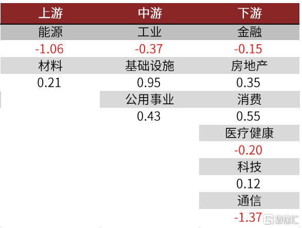 風格及行業:中小盤價值風格資金相對佔優。1)風格:上週,全球市場在風格方面,大盤風格單週淨流入大幅收縮至88億美元,中盤風格ETF資金淨流入由4億美元上升至8億美元,小盤風格ETF資金淨流入由10億美元小幅擴張至20億美元。價值成長風格方面,成長風格邊際淨流入由13億美元收窄至10億美元,平衡風格資金淨流入大幅收窄至100億美元,價值風格資金淨流入大幅擴張至6億美元。2)行業:細分行業看,上游行業中材料行業錄得淨流入,周淨流入比例為0.21%,能源行業周淨流出幅度較大,為-1.06%。中游行業中基礎設施和公用事業均錄得淨流入,淨流入比例分別為0.95%和0.43%,工業錄得小幅淨流出。下游行業除房地產、消費和科技行業分別錄得小幅淨流入外,其他行業均錄得淨流出,其中通信行業周淨流出較為顯著,周淨流入比例為-1.37%。