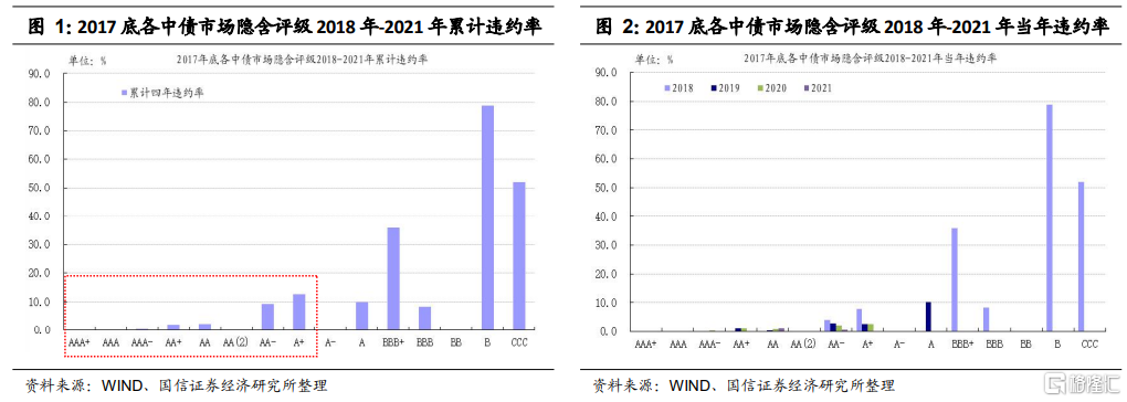 從過去四年的數據來看,2017年底中債隱含評級AAA的累計違約率爲0%,AA+的爲2.2%,AA級的爲2.4%,AA(2)的爲0%,AA-的爲9.5%;然後平均年度違約率AAA爲0%,AA+的爲0.5%,AA級的爲0.6%,AA(2)的爲0%,AA-的爲2.4%。