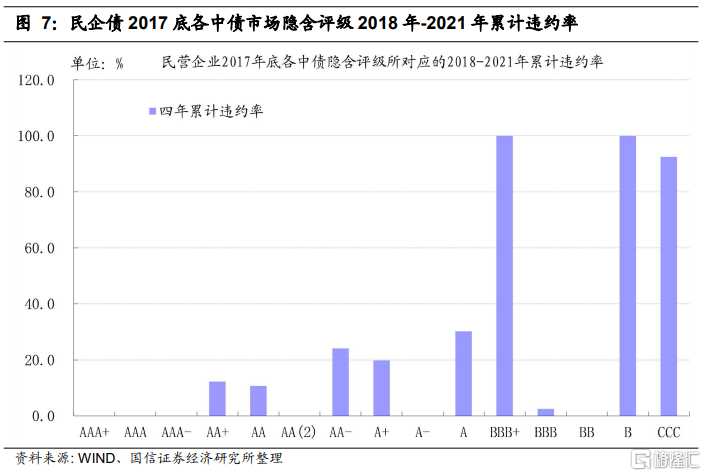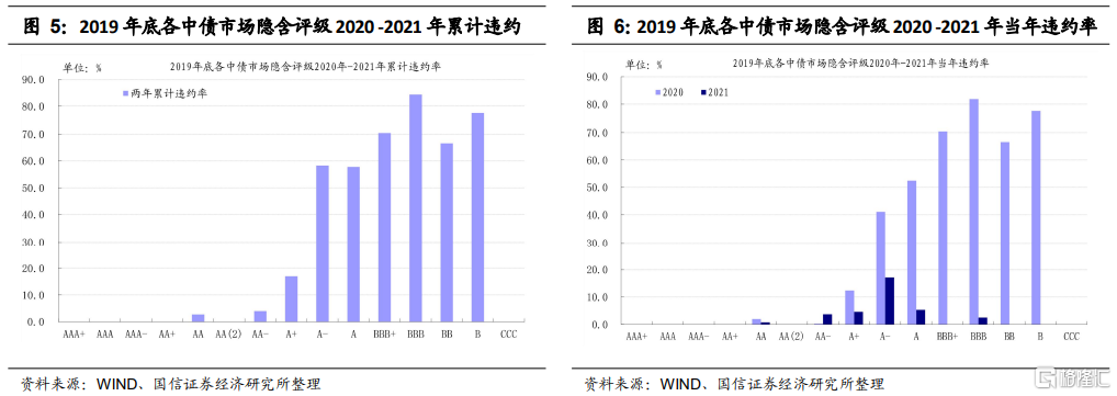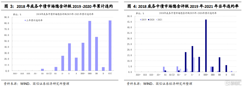 我們的數據處理方法爲:2017年底的存量非金融企業信用債債券,假設2018年對應的發行人出現某隻債券違約(WIND違約大全口徑,包括展期),發行人所對應的全部債券均記作在2018年違約,2019年、2020年和2021年處理方法類似。
