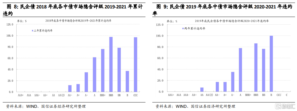如果我們單獨以民營企業爲樣本,來考察中債市場隱含評級的定價有效性,結論和全體樣本存在相似性,主要原因可能是2018年至2021年國內債券違約主體主要爲民企債。然後橫向對比來看,低等級民企債違約風險持續高於其他。