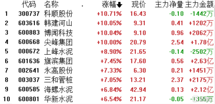 建築材料板塊集體上漲。科順股份漲超10%,韓建河山、博聞科技、尖峯集團漲停,上峯水泥漲超8%,淇濱集團、永高股份、三和管樁漲超7%,海螺水泥、華新水泥漲超6%。