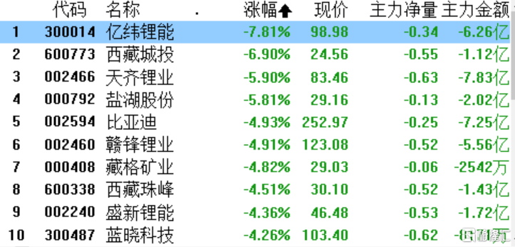 鹽湖提鋰的板塊遭重挫。億緯鋰能跌近8%,西藏城投跌逾6%,天齊鋰業、鹽湖股份跌逾5%,藏格礦業、藍曉科技、比亞迪、贛鋒鋰業、西藏礦業、西藏珠峯跌逾4%。