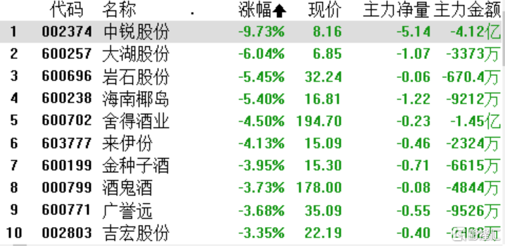 白酒板塊走弱。中銳股份跌近10%,大湖股份跌逾6%,巖石股份、海南椰島跌逾5%,捨得酒業、來伊份跌逾4%,金種子酒、酒鬼酒、廣譽遠、吉宏股份跌逾3%。