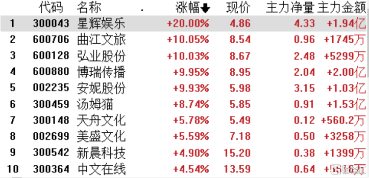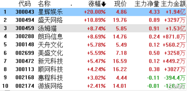 遊戲板塊強勢上漲。星輝娛樂漲停,盛天網絡漲超10%,湯姆貓、朗瑪信息漲超8%,天舟文化、美盛文化、新元科技漲超5%,順網科技、惠程科技、遊族網絡等跟漲。