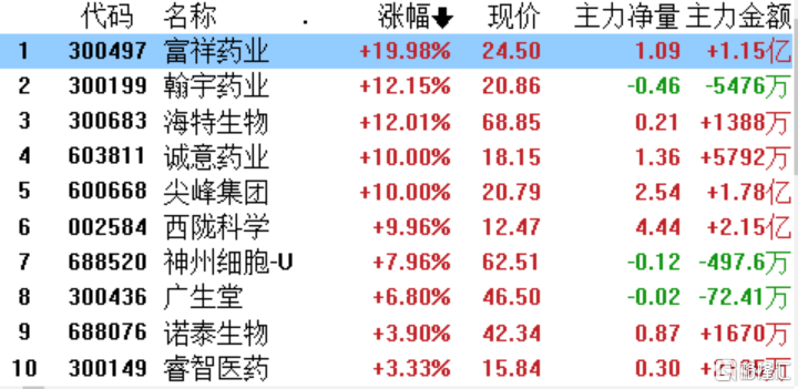 新冠特效藥集體上漲。富祥藥業、誠意藥業、尖峯集團、西隴科學漲停,翰宇藥業、海特生物漲超12%,神州細胞漲超7%,廣生堂漲超6%。
