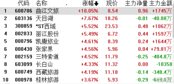 景點旅遊板塊表現活躍。曲江文旅漲停,天目湖漲超7%,ST西域、麗江股份漲超5%,凱撒旅業、張家界、三特索道、長白山、西藏旅遊漲超4%。