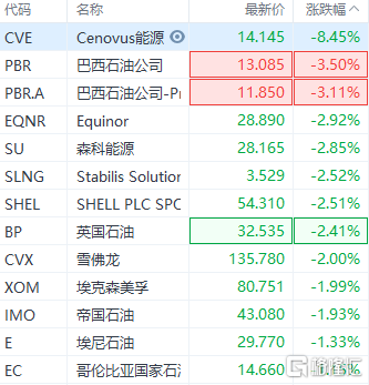 格隆匯2月8日丨美股石油股全線下跌,Cenovus能源跌8.45%、巴西石油跌3%,森科能源、英國石油、雪佛龍、埃克森美孚跌約2%。消息面上,國際油價大幅回落,WTI原油期貨下破90美元/桶,與布倫特原油期貨跌逾2%。