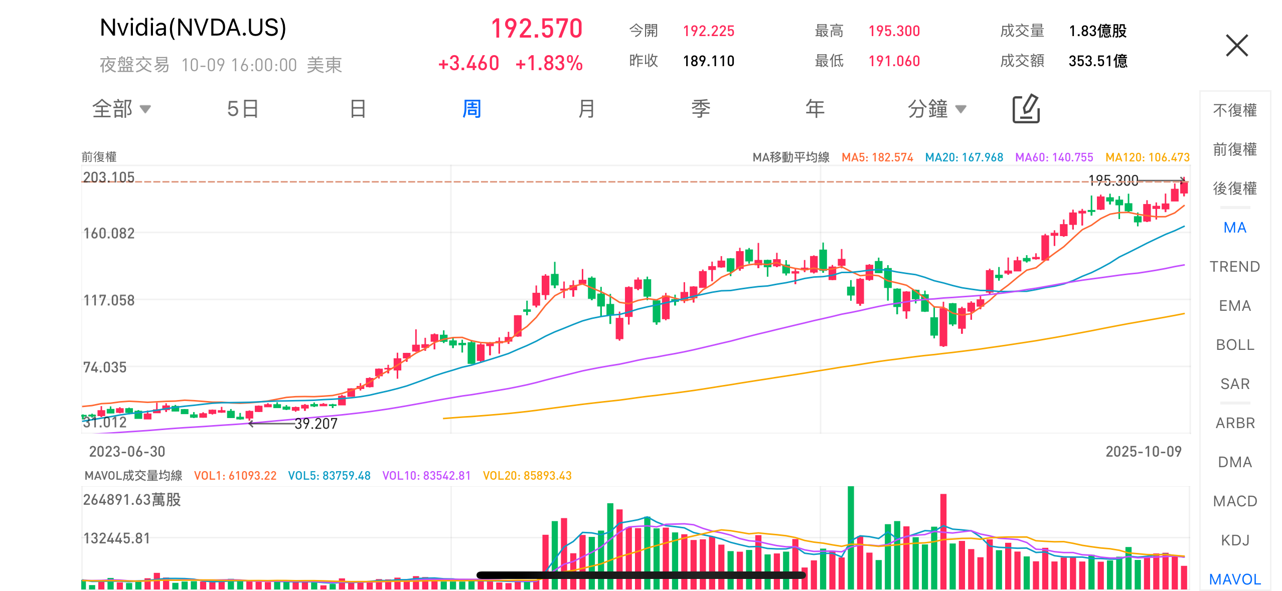 On October 9, 2025, NVIDIA (ticker: NVDA.US) surged to a new record high of US$192.57, gaining 1.83% for the day. Despite broader market fluctuations, NVIDIA once again demonstrated its leadership in the artificial intelligence (AI) sector. Driven by sustained demand for AI chips and computing power, NVIDIA’s share price has soared nearly 390% since mid-2023, far outperforming the Nasdaq Index over the same period — underscoring the company’s strong growth momentum.