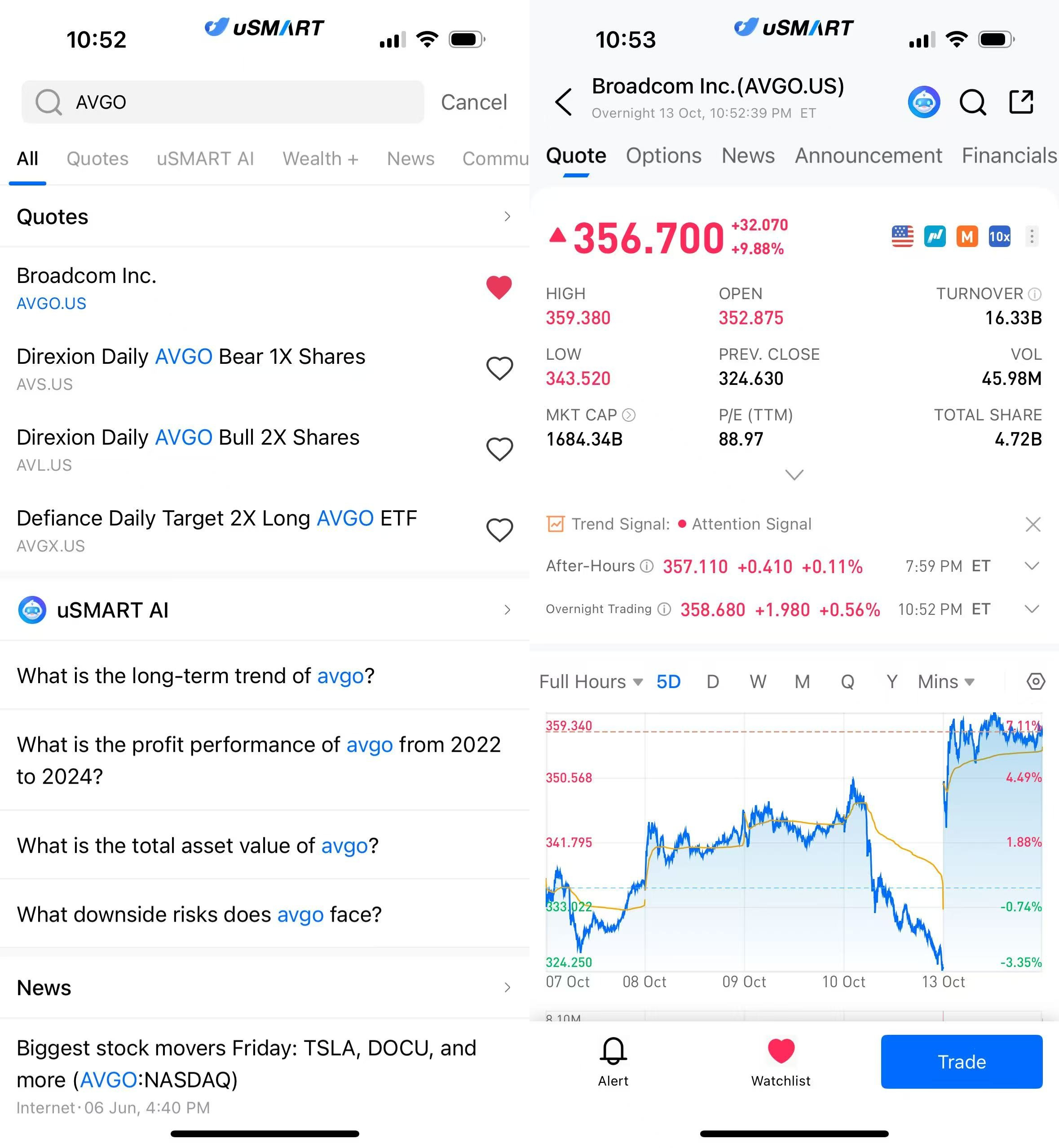 After logging into the uSMART HK app, click on “Search” at the top right of the page, input the stock code AVGO.US to access the details page and view transaction details and historical trends. Then click the “Trade” button at the bottom right, select the “Buy/Sell” option, fill in the transaction conditions, and submit your order.