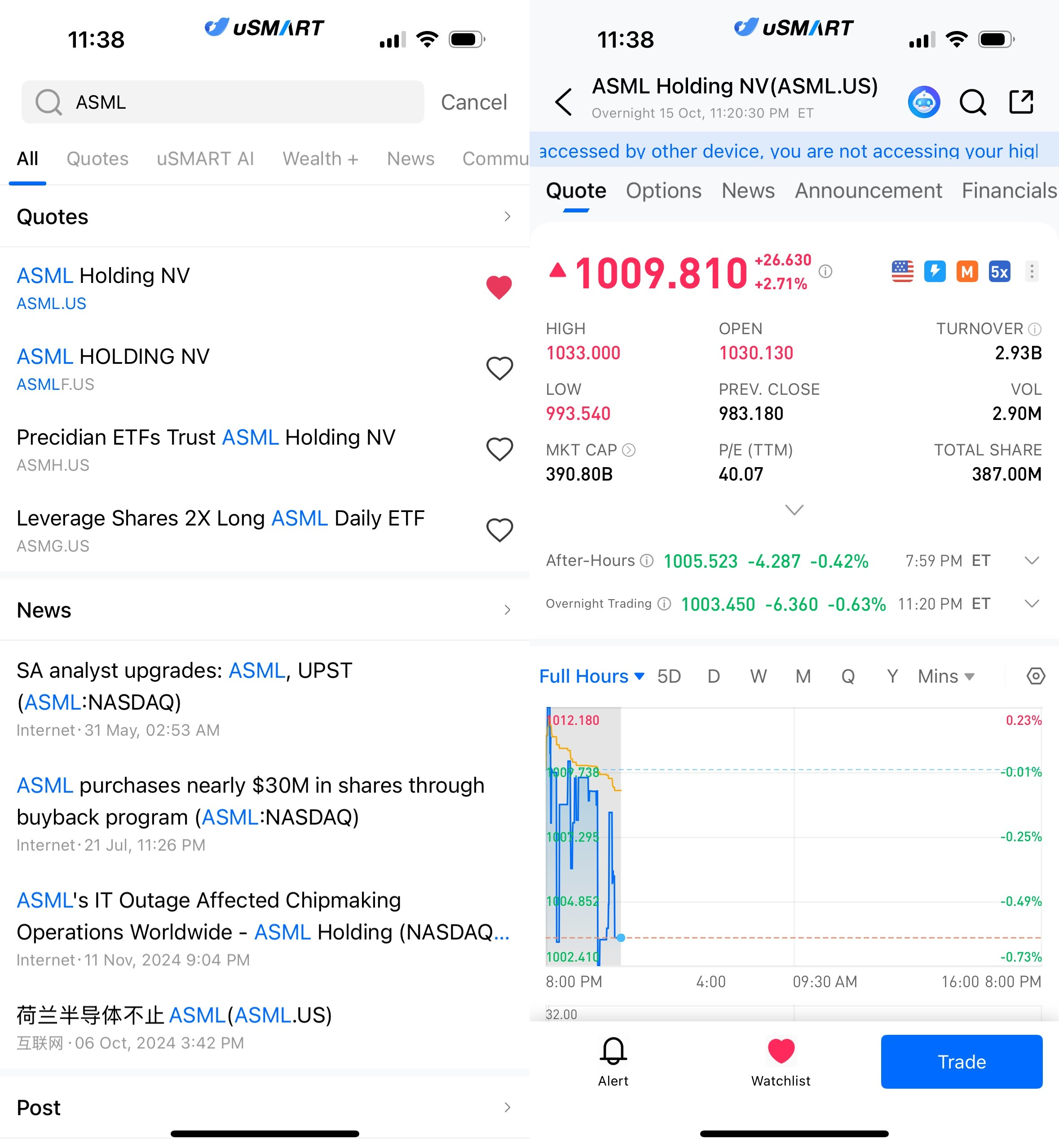 After logging into the uSMART HK app, click on “Search” at the top right of the page, input the stock code (ASML.US) to access the details page and view transaction details and historical trends. Then click the “Trade” button at the bottom right, select the “Buy/Sell” option, fill in the transaction conditions, and submit your order.