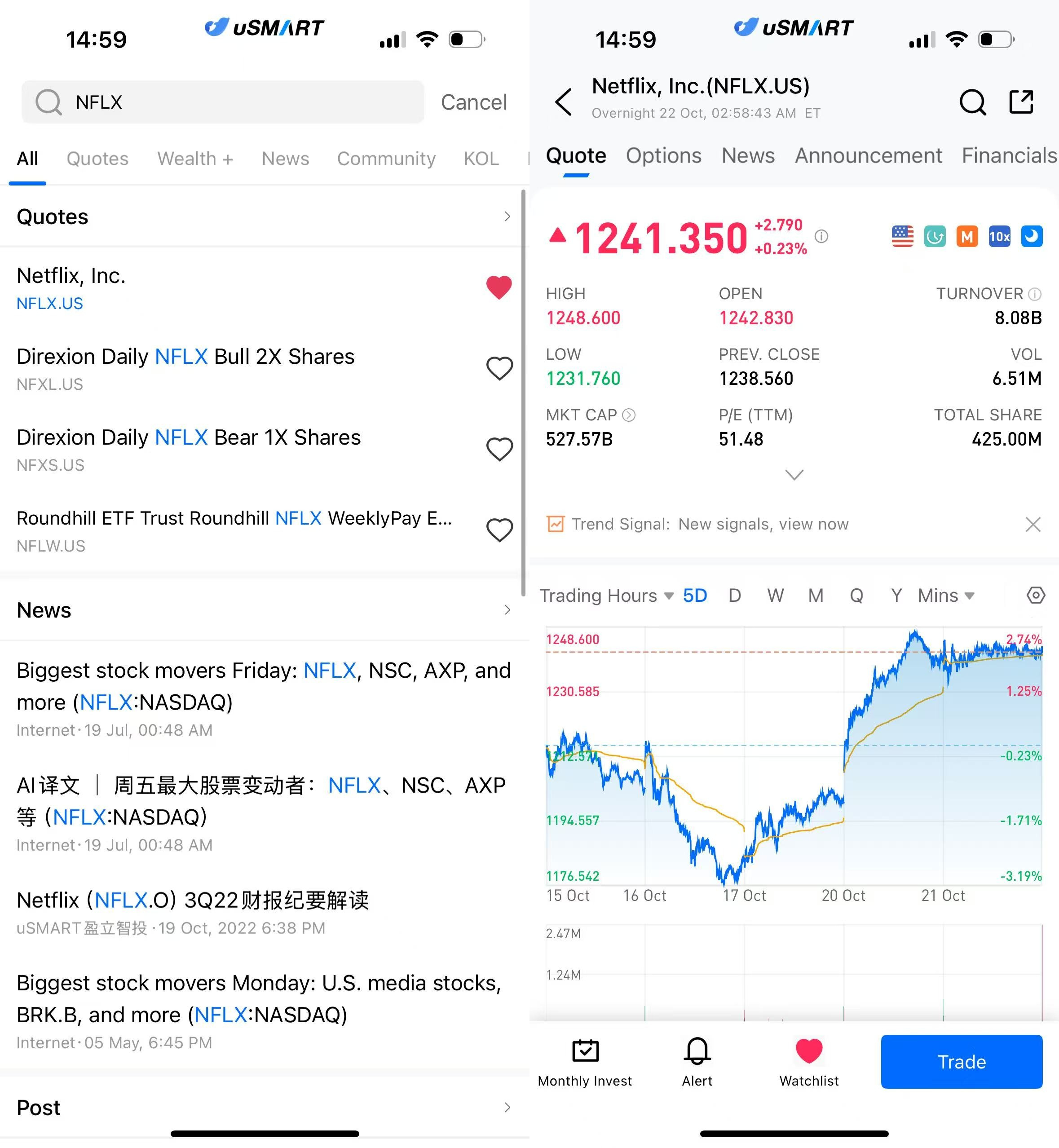 After logging into the uSMART HK app, click on “Search” at the top right of the page, input the stock code (NFLX.US) to access the details page and view transaction details and historical trends. Then click the “Trade” button at the bottom right, select the “Buy/Sell” option, fill in the transaction conditions, and submit your order.