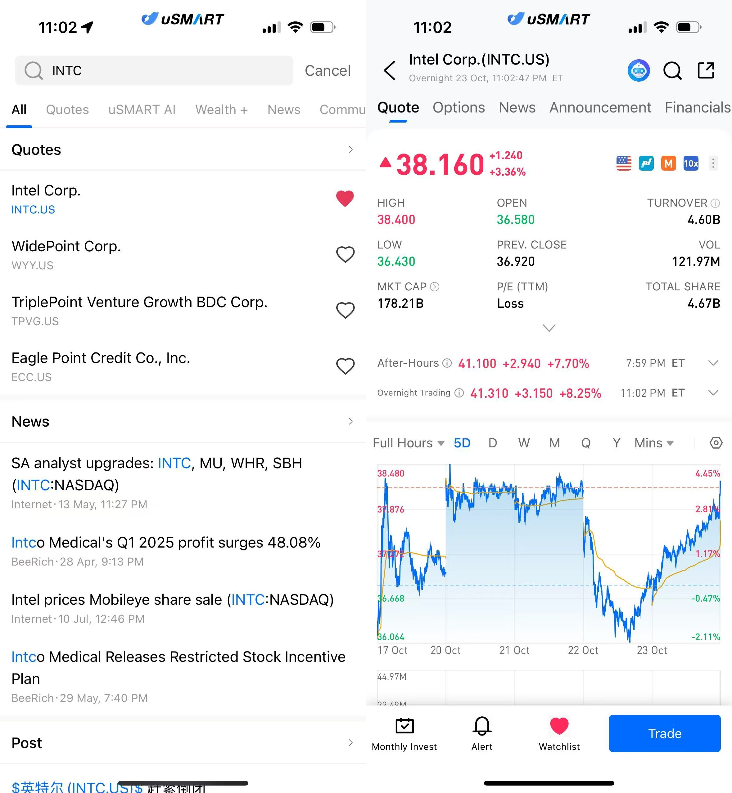 After logging in to the uSMART HK App, tap the search icon at the top right, enter the ticker INTC.US, and open the stock details page to review trading data and price charts. Tap “Trade” at the bottom right, select the trade type, enter the order details, and submit to complete your transaction.
