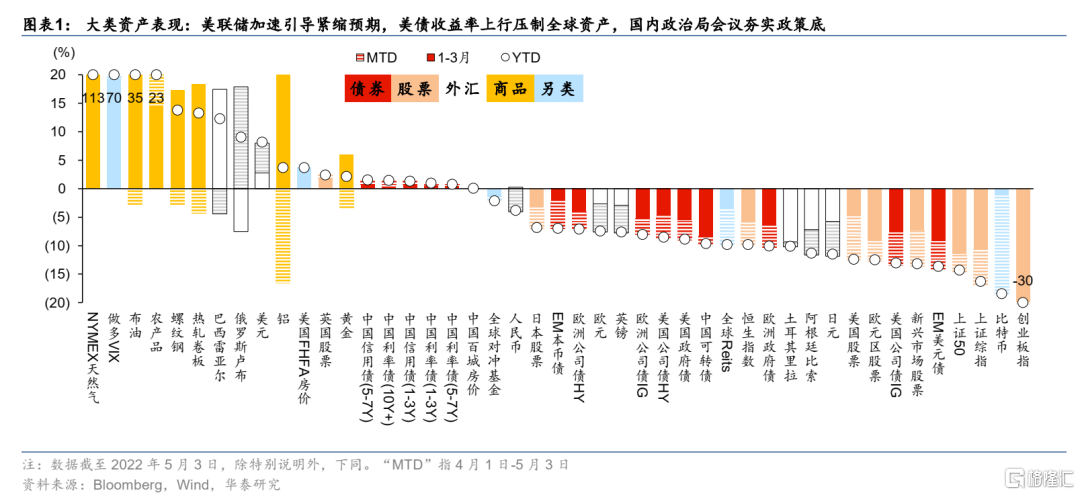 4月境外的主線是美聯儲加速引導加息縮表預期疊加俄烏衝突,美債收益率全月快速上行超60BP,一方面無風險利率的快速衝高壓制風險資產的估值,特別是“久期”相對偏長的成長股受到制約更明顯,類似風格也傳導到國內市場;另一方面,中美利差倒掛和人民幣匯率走弱也制約了國內貨幣政策的騰挪空間,月中降準落地但幅度只有0.25%,也限制了國內債市的進一步想象空間。國內主線仍是疫情防控與穩增長間的平衡,“五一”假期期間出行、票房等數據均相比去年同期下降,但4月末政治局會議定調“疫情要防住、經濟要穩住、發展要安全”,重新凝聚共識夯實政策底,進一步博弈穩增長政策仍有空間。