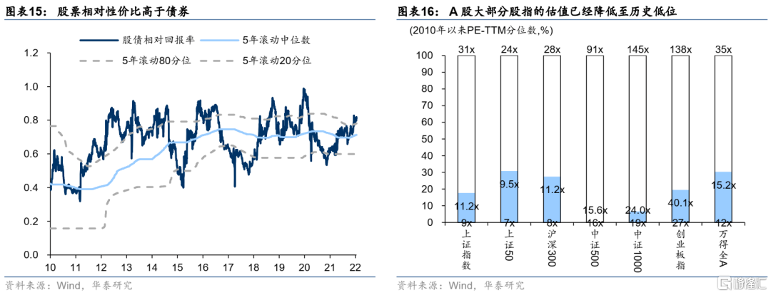 第四、估值方面,股債性價已經明顯偏向股,股指估值整體處於歷史低位,但除了中證500之外和底部仍有一定距離。滬深300股息率/10年期國債收益率指標目前高於5年滾動80分位數,股票相對性價比明顯高於債券。A股大部分股指的估值已經降低至歷史30%分位以下,不過除了中證500以外,和歷史大底還有一定的距離。