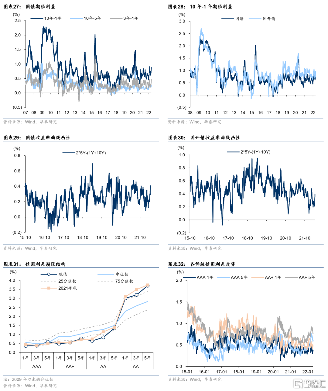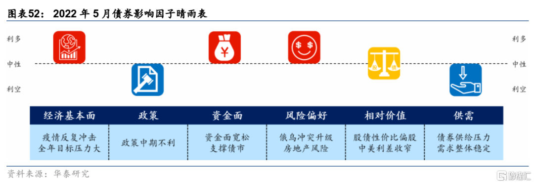 我們對債市的判斷是:1)債市短期最有利的因素還是資金面,基本面現實偏弱,但預期正在改善,從而約束短期利率的上行空間;2)中期來看,穩增長目標不動搖,地產繼續放鬆,美聯儲加息週期剛剛開始,股市政策底已經夯實,隨着時間推移,債市利空因素開始積累,這決定了仍要保持偏防守的姿態,還需關注是否存在收益率平坦化風險;3)預計短期內十年國債利率仍將在2.8-2.9%之間震盪,3.0%可能是中期相對確定的上行阻力位,操作更趨謹慎;4)節奏上,維持利率全年兩頭低、中間高的判斷,考慮到資金面風險不大,持有短期,並保持一定槓桿仍是較優策略,短端信用利差預計也將維持低位,長端如果繼續上行可以博弈金融數據等機會。5月份上半月存在資金面、疫情和金融數據支撐,下半月不確定性較大。