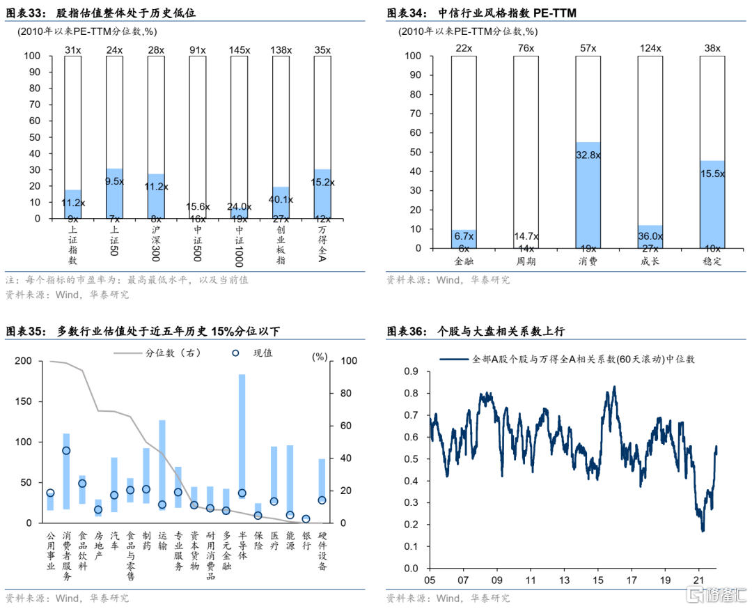股市受業績信息、長假效應衝擊加速探底,政治局會議迴應市場關切,後續市場底的確認還需關注宏觀邏輯的逆轉和底部信號的出現。A股市場整體估值進一步下降,主要股指進入底部區域,多數行業處於近五年曆史15%分位以下,個股與大盤相關係數上行。股票估值、盈利雙殺反映已較爲充分,市場演繹的是悲觀情景。中期來看,市場對利好的敏感度可能會慢慢超過利空,業績期、長假效應衝擊過後估值可能進入低波動期。