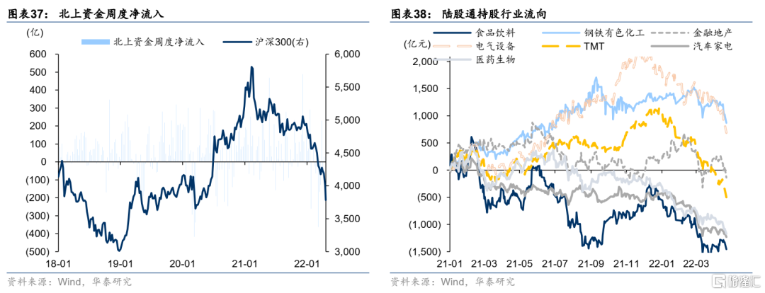 資金流向層面,中美經濟和政策週期分化,美債收益率上行,中美利差收窄,人民幣貶值壓力陡增,北向資金淨流出壓力持續,但已有所緩解。國內穩增長、海外抗通脹主線未變,美聯儲加息+縮表組合拳,中美利差已大幅收窄甚至出現倒掛,人民幣計價資產吸引力下降。4月資金仍呈淨流出狀態,但規模有所收斂,4月北上資金淨流出16億,較3月的451億淨流出規模已大幅縮窄。陸股通鋼鐵有色、電氣設備、金融地產、TMT減持幅度較大。後續仍需注意全球流動性收緊和行業政策對北上資金可能形成的擾動。