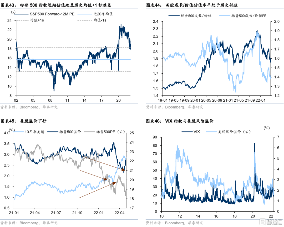 美聯儲收緊疊加美股業績期擔憂,風險資產估值承壓,標普風險溢價下行,成長/價值估值水平處於歷史低位,需要提防美聯儲持續收緊下,美股市場波動對全球風險資產的情緒傳導。俄烏局勢不明、部分地區疫情復發、美聯儲加息等壓制風險偏好。此外,美股業績對估值回落壓力支撐不確定性仍存,成長板塊不利因素更多,導致美股4月以來持續回調。近期標普500指數遠期估值水平約17.9x,略低於近20年曆史均值+1標準差,標普500成長相對於價值板塊估值水平處於歷史低位。