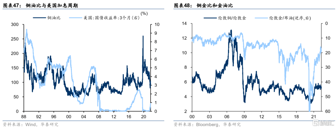 俄烏衝突等地緣政治衝擊,疊加美聯儲加息和縮表週期,歐洲滯脹風險更大,全球大宗商品價格波動加大,銅油比繼續向低位運行。能源等大宗商品的供需本身便處於緊平衡狀態,俄烏衝突導致供給收縮,油價和糧食價格進一步上漲。商品相對錶現來看,銅金比仍區間震盪。美聯儲加速收緊疊加歐央行可能轉鷹,黃金上行趨勢受阻,但中國疫情對油價有所拖累,金油比略有回升。