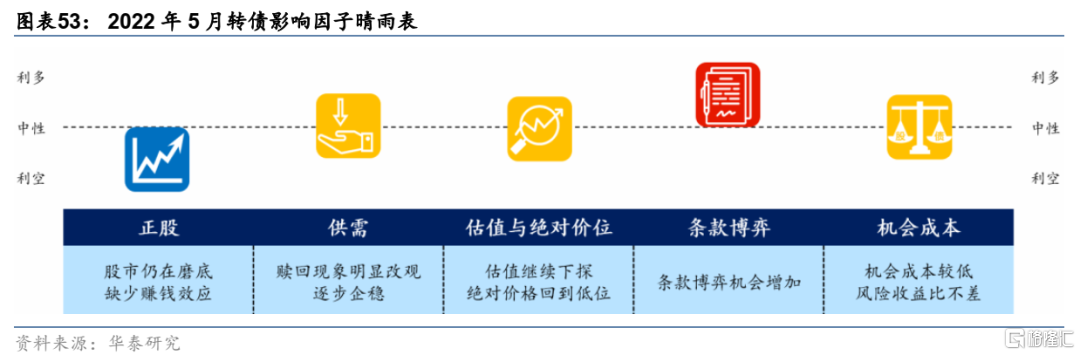 5)機會成本:現階段,轉債債性好、股性差,性價比略不及正股但安全性可能更好。債市機會成本仍較低,利率波動空間有限、信用下沉性價比仍不高。