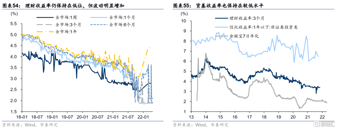 3)理財淨值化持續推進背景下,淨值波動率成爲了理財的新考察維度,收益率逐步隨着可投資資產收縮、債券收益率下行而下降。資管新規過渡期結束臨近,銀行理財產品的轉型壓力增加,理財吸引力總體下降趨勢難改。貨基收益率仍位於2004年以來低位附近;