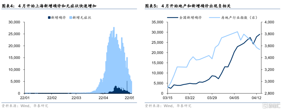 但在此前,“現實經濟越弱、政策預期越強”的邏輯沒能繼續演繹,市場擔心政策空間,且難以觸及根本。4月上海新增確診人數快速增加,多地出現擴散風險,實現全年增加目標難度陡增。而政策似乎並沒有做出足夠力度的應對,基建、地產的核心掣肘未見緩解,央行降準25BP的效能有限。經濟增長的“錨”出現失位風險,市場信心出現明顯動搖。以典型的穩增長板塊——房地產爲例,3月下旬和新增確診人數呈正相關,體現“現實越弱、預期越強”的思路,但是4月後轉爲明顯負相關,說明“政策期權”出現失效風險。