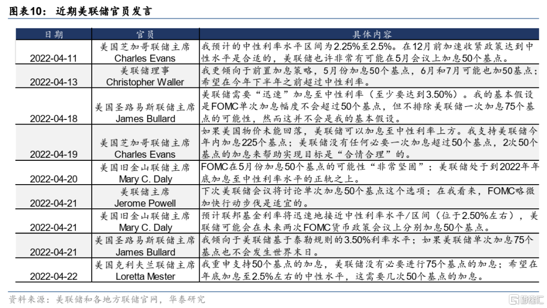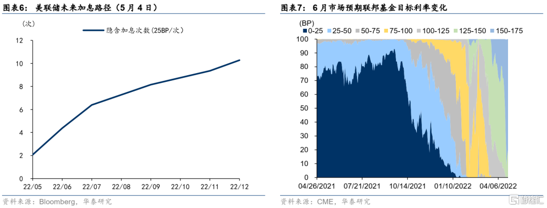 第三、美聯儲加息縮表聲聲緊,對全球流動性和資產估值帶來衝擊。4月下旬以來出現了典型的股債匯三殺行情,其中美聯儲政策緊縮是核心變量,除了5月加息50BP並啓動縮表,市場甚至出現了6月加息75BP的預期(聯邦基金目標利率達到150~175BP),對全年剩餘加息次數的預期高達10次。同時疫情挫傷國內經濟,制約出口,進一步增加了人民幣貶值壓力。