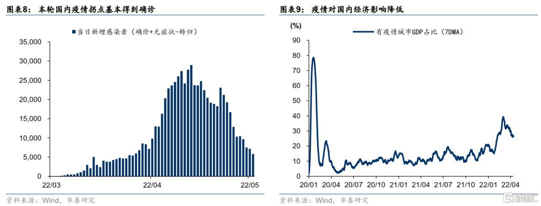 第二、本輪疫情拐點隱現,對經濟的制約仍難以根本解除,但市場情緒有望得到提振。從4月中旬開始,國內疫情開始出現拐點跡象,4月29日開始新增確診人數(確診+無症狀-轉歸)降至四位數。作爲本輪疫情的焦點區域,上海於4月29日首次實現社會面清零,其他省市疫情也基本得到有效控制,其中北京疫情仍需要觀察,由於防控升級閾值較低,對經濟和生活的擾動仍會反覆。從我們的統計來看,有疫情城市的GDP佔比也已降至26.2%左右,交通運輸和生產鏈開始有所恢復。