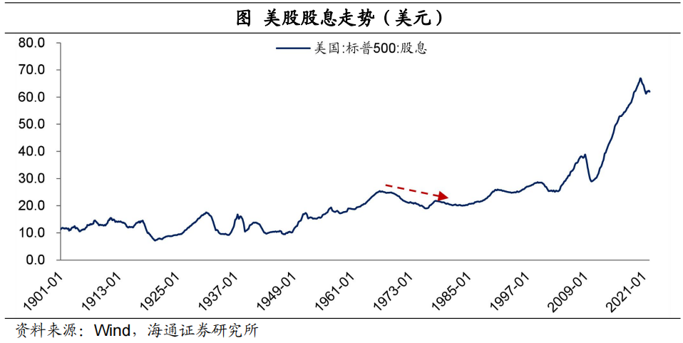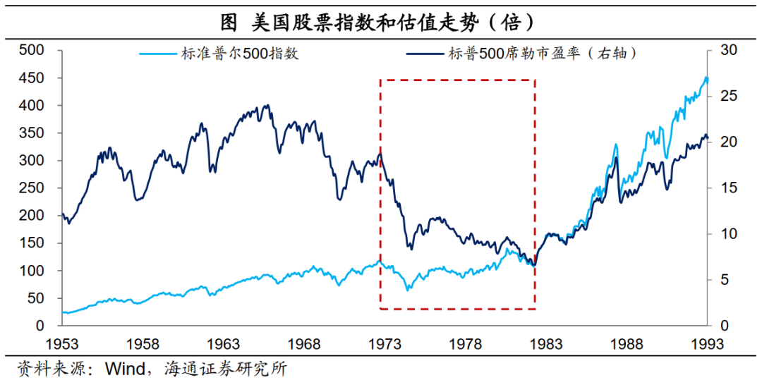 美股的表現可謂比較慘淡。一方面,大宗漲價推升經濟成本,衝擊企業盈利,在整個滯脹期間,美股股息明顯下滑;另一方面,利率的大幅上升,打壓權益資產的估值,標普500市盈率從最高時的18倍以上,最低降至只有7倍附近。標普500指數從1973年開始下跌,最大跌幅高達46%,直到1974年9月以後纔開始觸底慢慢回升。