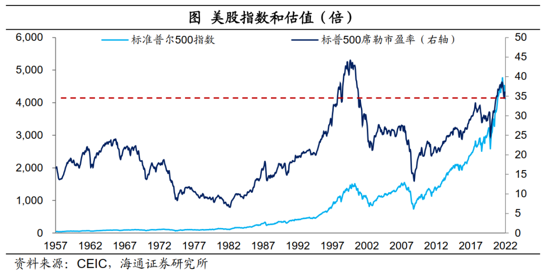 美股或依然存在壓力。從宏觀面來看,美國需求端相對還比較強勁,當前經濟還處於典型的通脹階段,但未來經濟實際增長回落的可能性比較大,即慢慢也陷入滯脹的困境。參考之前的經驗,高利率、高通脹、低增長的滯脹環境,並不利於權益類資產的表現。而且當前權益估值還處於歷史高位,或依然存在一定的調整壓力。