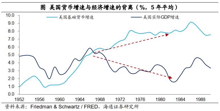 在60年代中期之前,美國的基礎貨幣增速平均比實際經濟增速低1.8個百分點;而之後美國基礎貨幣增速開始超過實際經濟增速,而且幅度不斷擴大,從1967年至2007年,美國平均基礎貨幣增速要比經濟增速高3.9個百分點,貨幣超發勢必帶來了通脹壓力的增加。