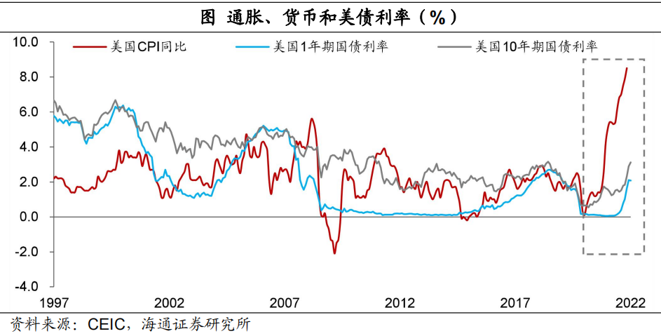 利率上行未止,長債的中長期配置價值在逐漸增加。對於美債來說,美聯儲本輪加息的步伐是很緩慢的,幅度也偏小,使得即使今年開啓加息後,美國名義利率仍然遠遠低於通脹水平。偏低的名義和實際利率,對通脹仍然有推升作用,所以儘管今年二季度美國CPI或因基數原因有所回落,但可能仍然在偏高的水平上徘徊。考慮到通脹的壓力,美聯儲本輪加息的時間可能也會比較長,而且利率終值可能高於上一輪。所以和80年代初有些類似,美聯儲貨幣政策的收緊,或支持10年期美債利率進一步上行,並逐漸與短債利率倒掛於高位。當然後續長債利率的上行速度會慢於短債利率,美元長債利率的中長期配置價值在逐漸增加。