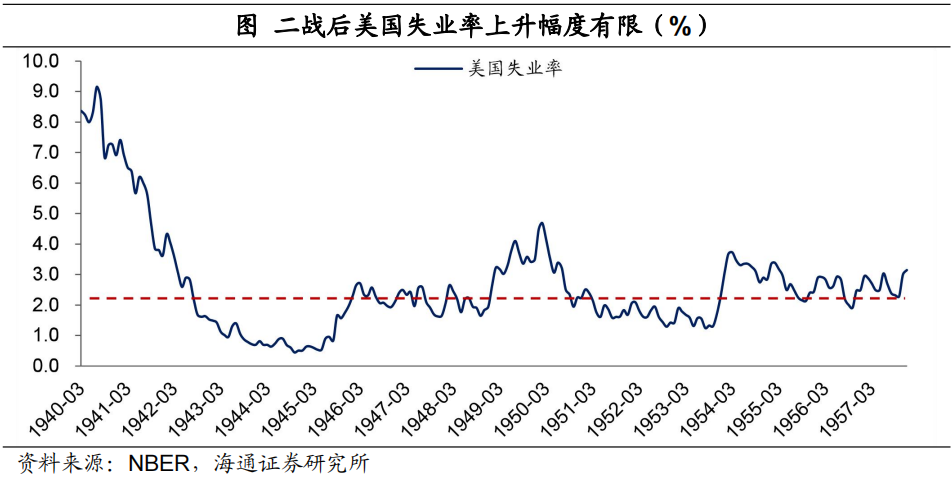 而在二戰結束後,政府開支明顯減少,美國經濟增速雖然有所回落,例如1945-1947年連續三年負增長,但這其實是一個從非正常高增長狀態向正常狀態迴歸的過程,經過二戰後,美國經濟徹底擺脫了大蕭條期間疲弱的狀況。其實當時美國經濟並不差,失業率水平雖然有所擡升,但幅度是非常小的,因爲二戰時期的超低失業率狀態本身就不是常態。而且由於二戰期間居民賺取了大量收入,而這些收入在二戰結束後迅速轉變爲消費能力,直接推升了美國的通脹水平。所以二戰結束後,美國經濟狀況依然是比較強勁的,雖然通脹比較高,但並不能說是嚴格意義的滯脹。