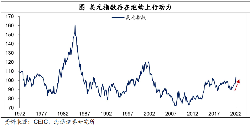美元指數在未來幾個月仍然有上行動力。美國國內貨幣政策還在收緊,利率水平在擡升,而且美元指數本身就是各國之間經濟相對強弱的體現,在當前主要經濟體中,歐洲已經陷入滯脹,貨幣政策或小幅收緊,日本經濟增長乏力,貨幣政策寬鬆繼續,這些相對變化也支持美元指數或進一步上行。
