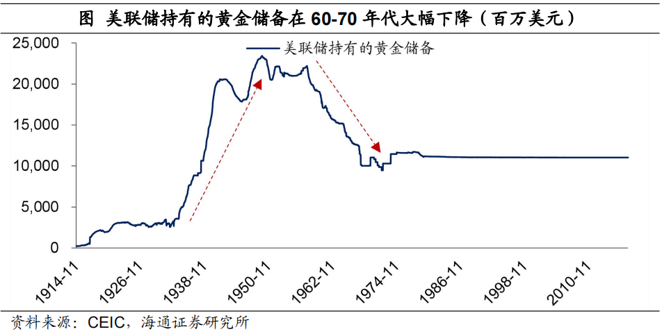 第二,紙幣的信仰面臨挑戰,各大央行控制通脹的決心和能力受到質疑。二戰以後,在佈雷頓森林體系的安排下,美元掛鉤黃金,其它貨幣掛鉤美元,紙幣的發行還是受到一定限制的。但隨着美國國際收支赤字的不斷擴大,人們對美元的信心逐漸減弱,不斷用美元兌換黃金,美聯儲持有的黃金儲備大幅下降。1971年美國停止了美元兌換黃金,1973年佈雷頓森林體系徹底崩潰,全球進入了紙幣發行不受控制的時代。
