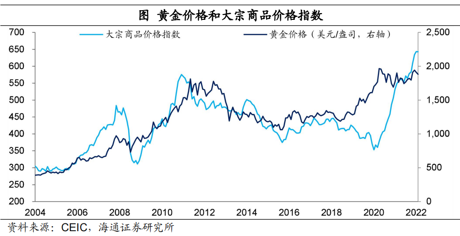 從大類資產的走勢來說,貨幣超發和需求推動的大宗商品漲價可能已經接近尾聲,但供給端壓縮的支撐作用依然較強。今年以來美債實際利率大幅上行,反映紙幣的實際回報率在提升,所以理論上來說黃金價格應該繼續下跌。但事實是,金價非但沒有下跌,還出現了上漲,這主要是地緣風險發酵在支撐。而黃金價格往往領先其它商品價格,黃金價格在經歷2020年上半年的大漲後,出現滯漲甚至下跌,其它大宗商品價格隨後大幅上漲,並且已經經歷了兩年的牛市,去年的漲幅甚至超過了30%。理論上來說,今年貨幣超發對大宗的支撐應該會弱化,但隨着地緣風險對供給端的衝擊,大宗進一步出現了漲價。