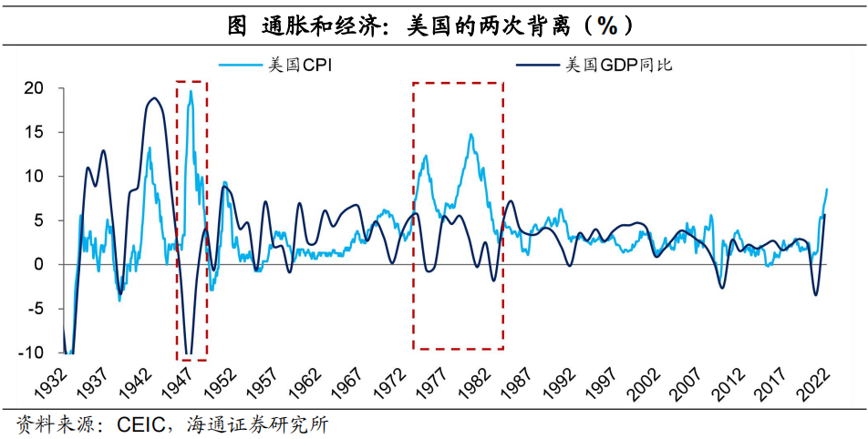 自20世紀30年代以來,美國總共出現過兩波明顯的經濟和通脹的走勢背離。第一波是在二戰結束後的幾年內,尤其是1946、1947年,經濟負增長,而通脹卻維持在高位。第二波是在70-80年代,經濟增長低迷,但通脹很高。