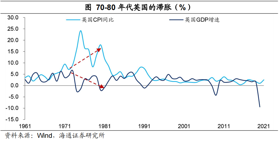 而且不僅僅是美國,在上世紀70-80年代,其它主要的發達經濟體均出現了比較明顯的滯脹。例如,英國最高CPI同比達到24%,而經濟增速卻明顯下臺階,一度出現負增長。