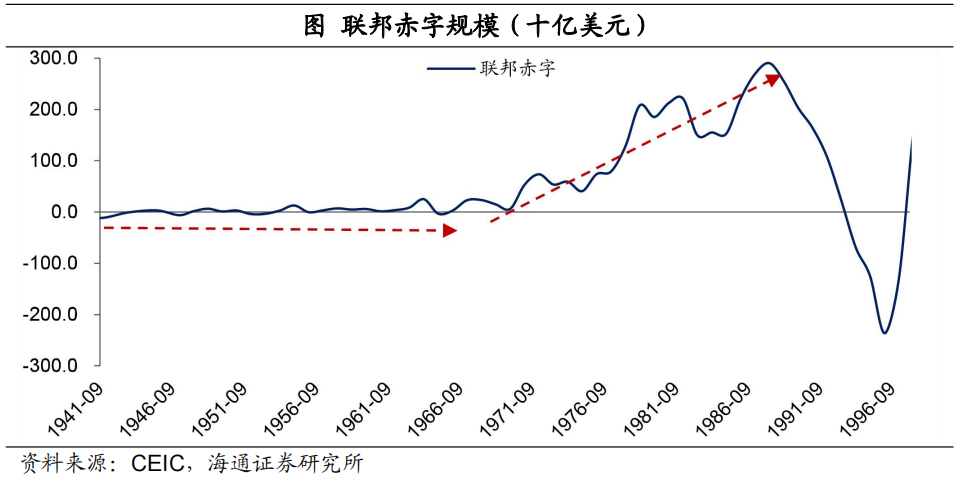 從歷史上來看,貨幣的超發往往是伴隨着財政的擴張的,而且財政擴張往往是貨幣超發的重要途徑。例如在一戰期間,軍費開支推動美國財政大幅擴張,貨幣跟隨超發,帶來了明顯的通脹壓力。在60年代之前,美國的財政赤字程度是比較小的,而且大多數時間是處於盈餘的狀態。從1964年開始,美國當時總統Lyndon Johnson推出了實行多年的“偉大社會”計劃(Great Society Legislation),本質上就是一攬子財政刺激方案,再加上當時越南戰爭的開支增加,美國的財政赤字明顯擴張。與此同時,當時美聯儲的貨幣政策配合財政的擴張計劃,一方面延遲貨幣政策的收緊,另一方面不斷向銀行體系注入流動性,爲政府債券的發行保駕護航。