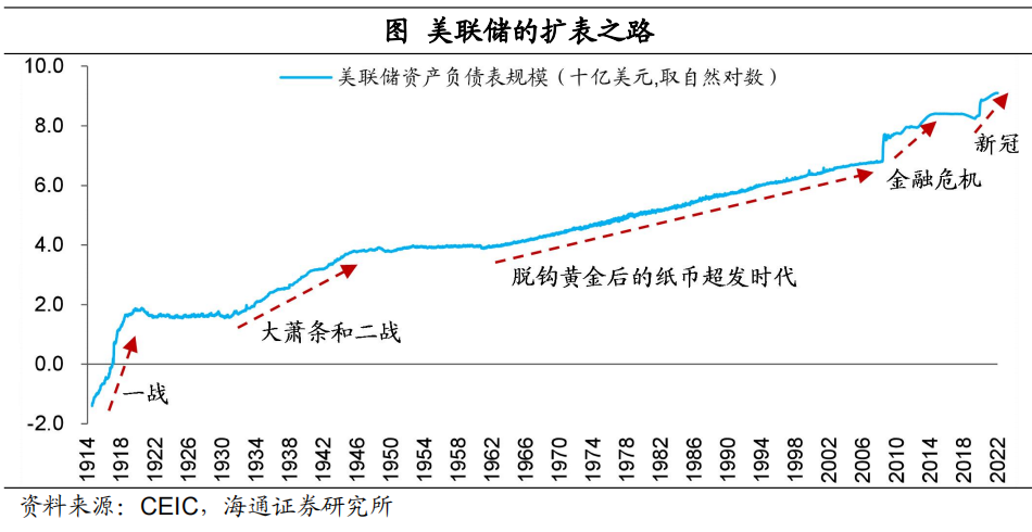 從貨幣超發的角度,2020年面對新冠疫情的衝擊,主要央行都在大幅超發貨幣,而且貨幣和財政配合,這和一戰、二戰、60年代都比較類似,而且這一次力度更大更迅猛。