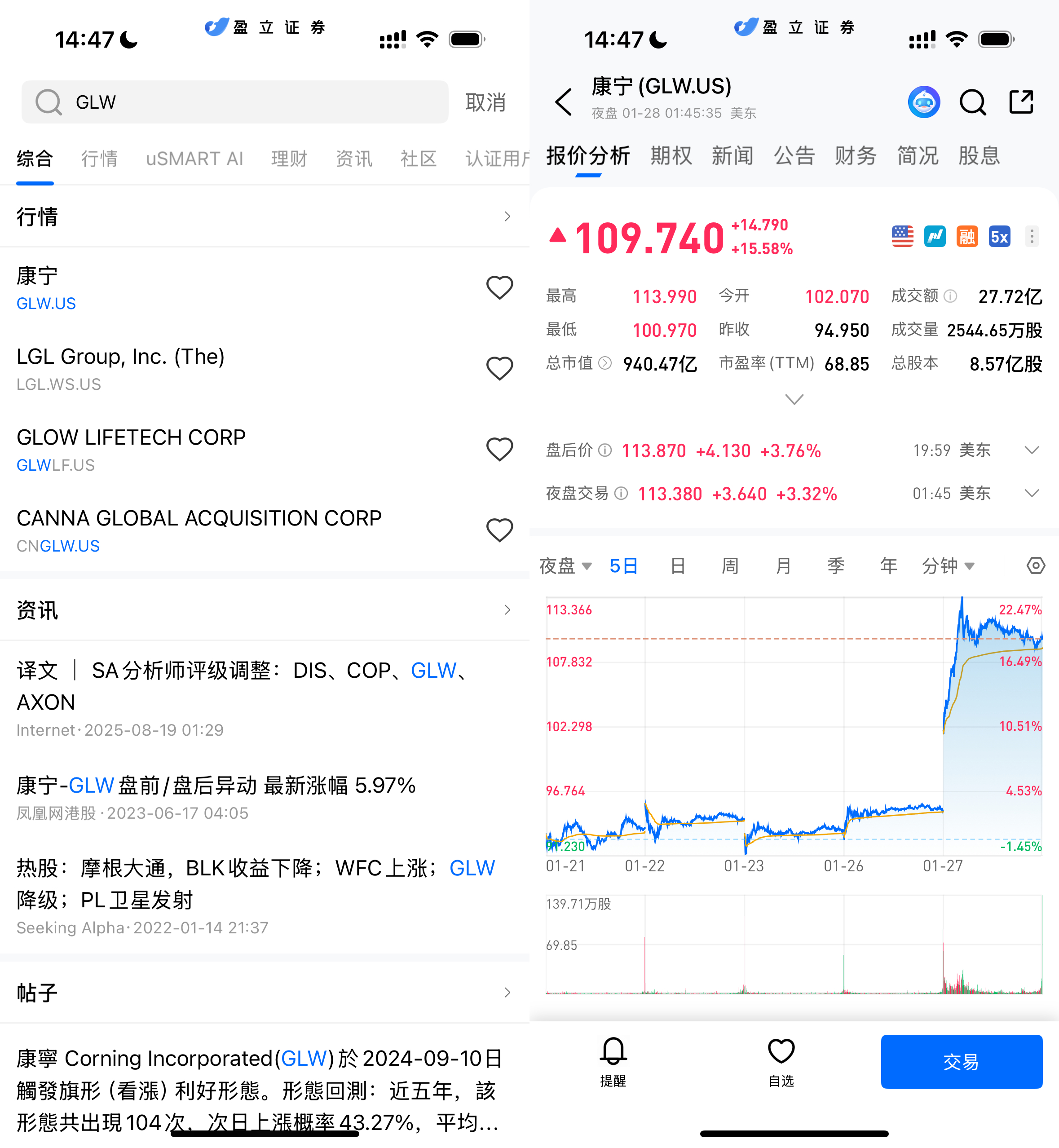 After logging into the uSMART HK app, click the “Search” button in the top-right corner of the page, enter the ticker code (GLW.US), and navigate to the details page to view transaction details and historical trends. Click the “Trade” button in the bottom-right corner, select the trade type, and submit your order after filling in the transaction conditions.