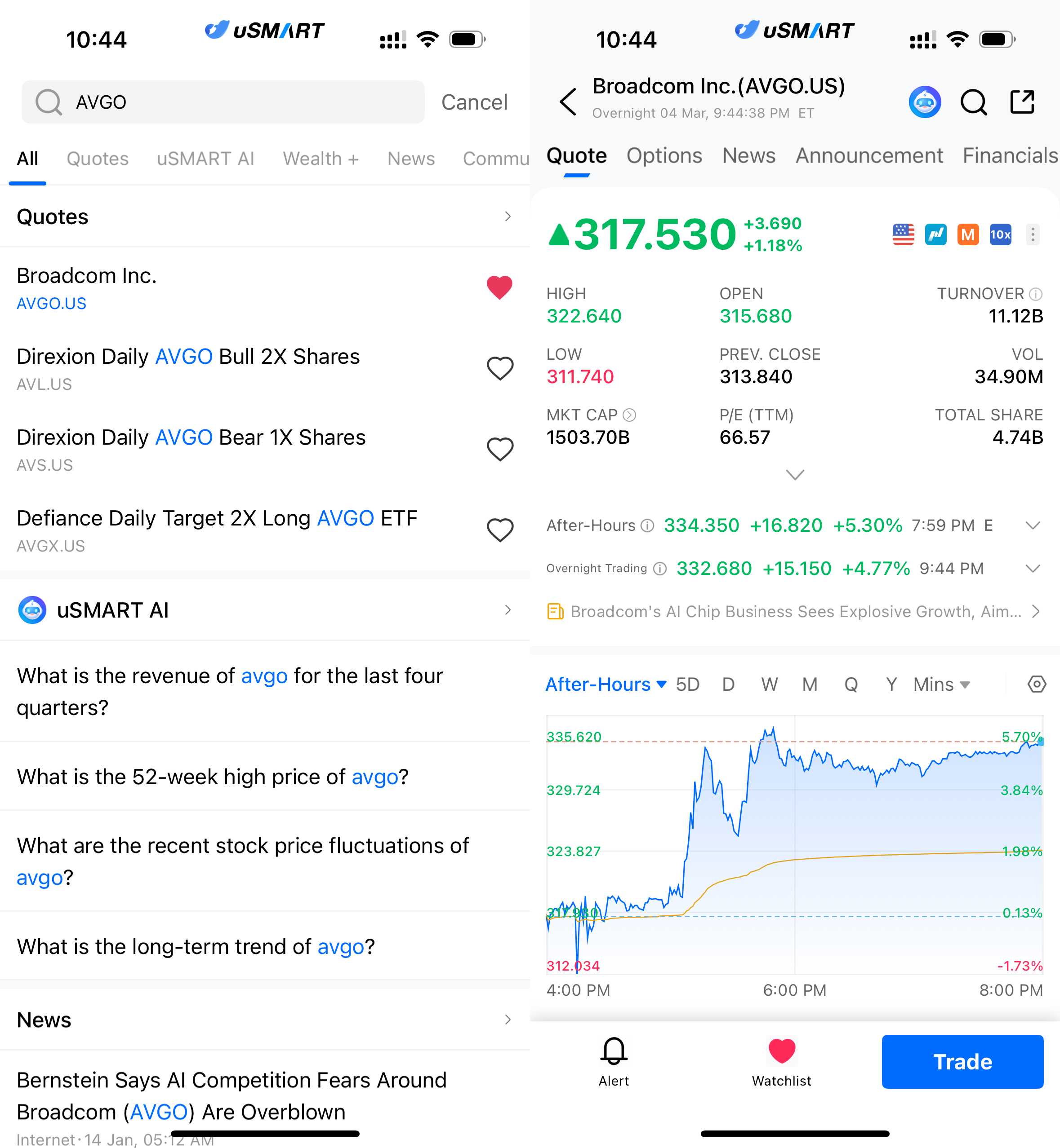 After logging into the uSMART HK app, click the “Search” button in the top-right corner of the page, enter the ticker code (AVGO.US), and navigate to the details page to view transaction details and historical trends. Click the “Trade” button in the bottom-right corner, select the trade type, and submit your order after filling in the transaction conditions.