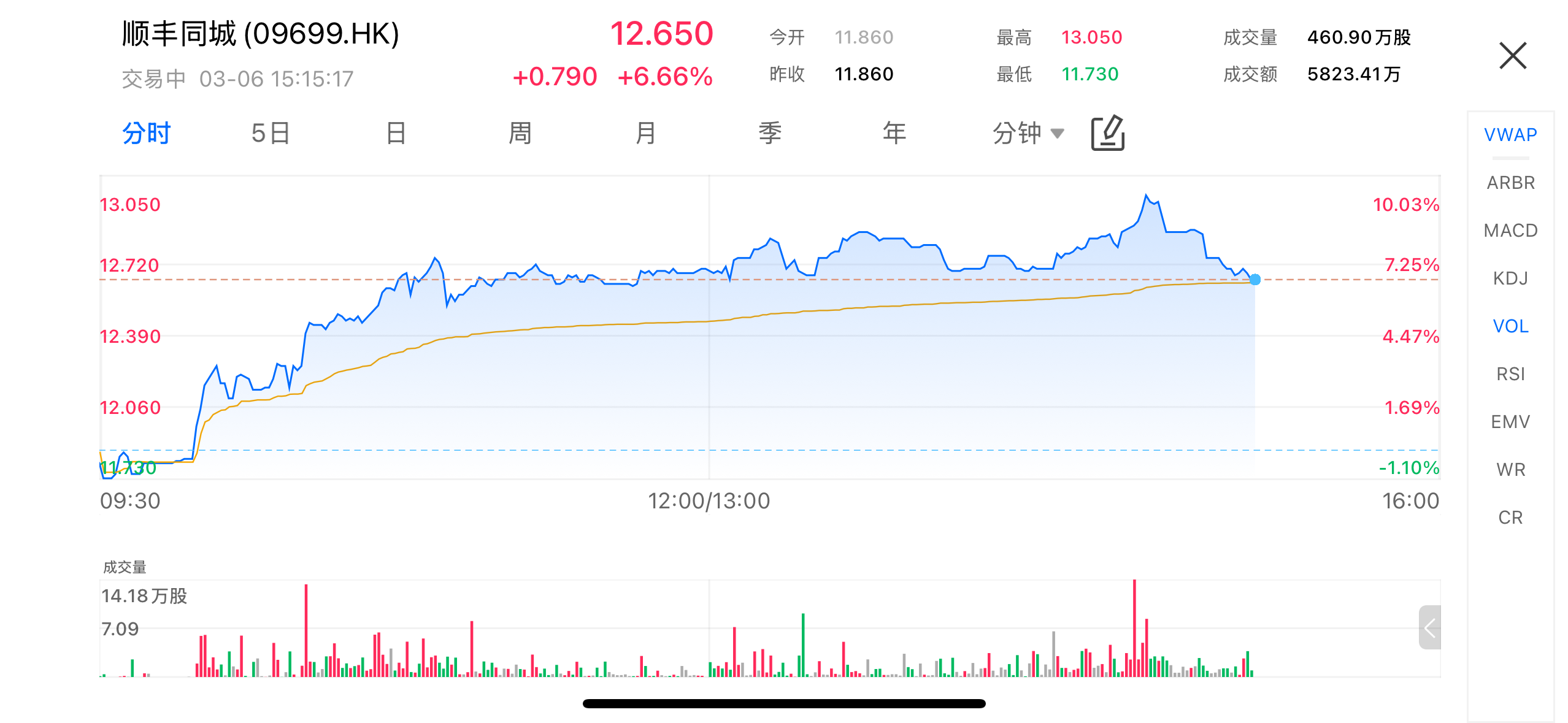 In early trading on the Hong Kong market, SF Holding’s same-city delivery business (09699.HK) continued to climb. As of 3:15 PM local time, the stock was quoted at HK$12.65, up 6.66%, with a total trading volume of approximately 4.609 million shares and turnover of HK$58.23 million. The share price surged from an opening low of HK$11.73 to an intraday high of HK$13.05, showing a clear upward trend.