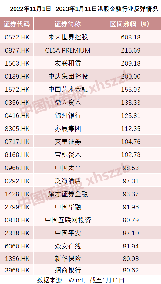 記者發現,2022年11月以來至今,恆生指數觸底反彈,不少金融H股漲勢強勁,如未來世界區間內漲超600%,錦州銀行漲超120%,中國太平、中國華融、中國平安等漲超85%。