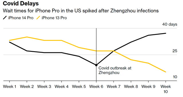 即使對iPhone的需求沒有惡化(這是一個值得驕傲的假設),投資者也應該考慮到,蘋果的收入無疑受到了供應擔憂的壓力。值得注意的是,據估計,蘋果90%的硬件製造是在亞洲完成的,其中很大一部分是在華。大流行可能嚴重影響了該公司的供應鏈。一些分析師預計2023年第一季度iPhone的產量將短缺約600萬部。此外,作爲蘋果的高利潤產品,iPhone 14 Pro的交付等待時間也大幅增加。