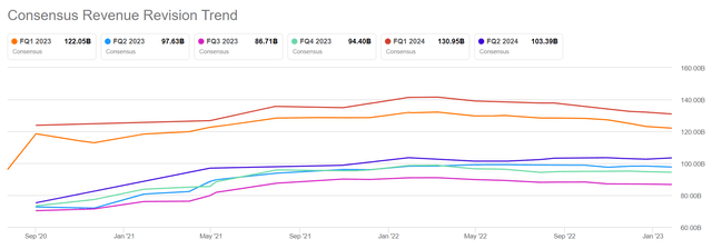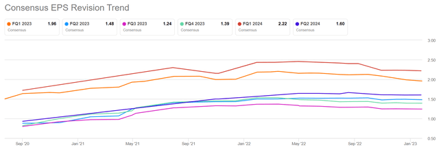 同樣,2023年第一季度的EPS預期在過去幾個月裏也沒有太大變化。事實上,分析師預計每股收益接近2美元,這已經在2021年底做出了預測,當時宏觀形勢非常好。