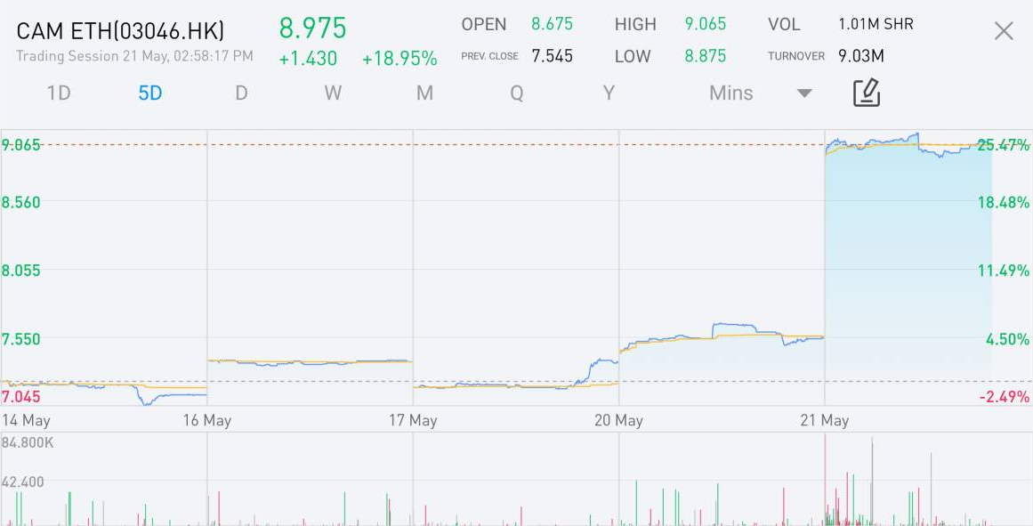 Amid this positive news, most Hong Kong-listed crypto ETFs have seen gains, with the CAM ETH (03046.HK) and the BOS HSK ETH (03009.HK) rising over 25% at their peaks. The HGI ETH (03179.HK) surged over 19%, while the CAM BTC (03042.HK) gained 6.65%.